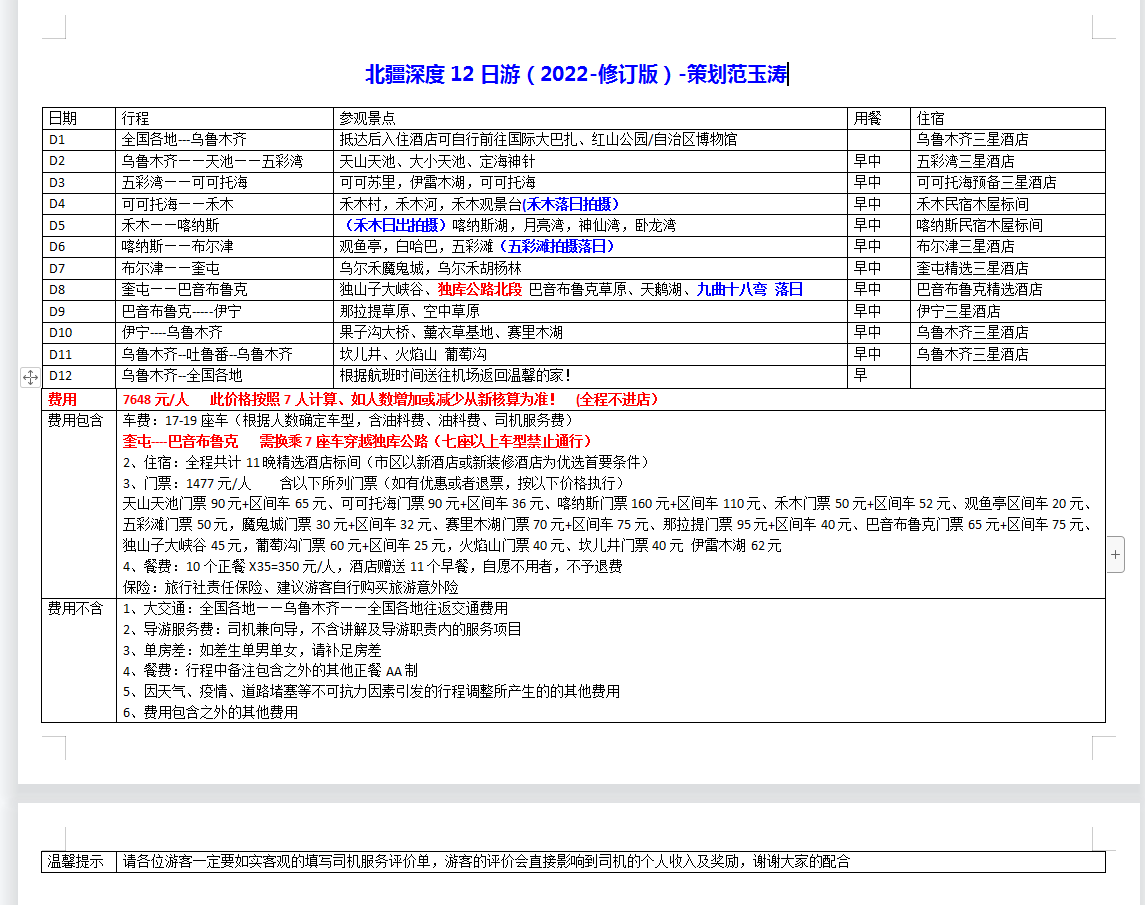 目的地:喀納斯,禾木、獨庫、伊犁 出發日期:2022-06-02出發 出游天數:12天 成人:10人 兒童:0人 出發地:烏魯木齊