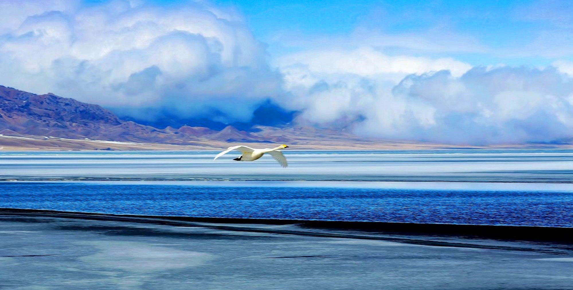 1、白沙湖的白沙山與湖水的藍(lán)形成鮮明對(duì)比,背景是巍峨的雪山,構(gòu)成一幅絕美畫卷。